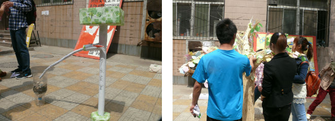 本次“环保周”活动为期五天,将分别在八食、二食广场全面展开,通过采访相关组织人员,我们了解到此次活动的主题为“节约资源,大力建设生态文明”。活动现场,最引人注目的是由4000多根废旧一次性筷子制作的“筷子许愿树”,寓意着“如果没有水,树木就会干枯的如筷子一般”,警示大家切勿乱砍乱伐。此外,呈水龙头状的“净水节水装置”也吸引了不少同学驻足观看,长长管子似向一个容器中注水,却发现容器中只有沙粒石头,暗示同学们生活污水将引起严重的水土流失现象。
