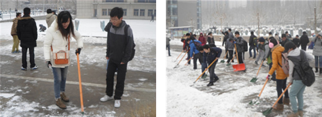 学生组织及大一、大二共十多个班级开展了大面积的义务扫雪活动。