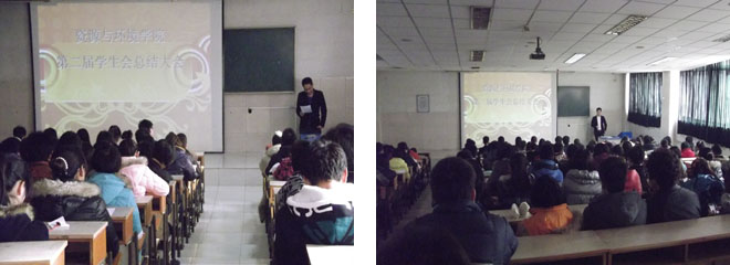 会议伊始,学生会主席高源以照片的形式在大屏幕上播放了资源与环境学院学生会在这一年中走过的每一步脚印。其中有学生会举办活动的场景照片;有学生会成员的生活照片;更有各种活动中体现出其团结一致的合影。他还对大家一学期来的工作表现给予了高度赞扬,在这一学期中,大家创造出了不少的佳绩,有微笑,也有微笑后的辛苦。随后,由学生会各部部长总结了自己部门在本学期中的主要成绩和在工作中的不足。部长们也纷纷表示,有这么多优秀的干事,相信明年的工作成绩会更上一层楼。最后,伴随着学生会工作照片的滚动,大会圆满结束。