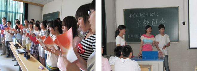 在共产党建党90周年到来之际,为号召大家学习党的辉煌历史,培养爱国主义情操,资源与环境学院环工0902班于6月2日下午在十教114举行主题为“学党史、知党情、跟党走”的主题班会,本次主题班会活动受到学院党委领导的高度重视,在陈卫东书记及团委老师的指导下取得了圆满的成功。