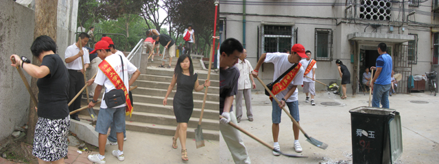17日上午,在与居委会相关负责人协商后,实践队队员与部分居民一同为小区清理卫生死角。队员们都兢兢业业,不辞辛劳的干着手中的活,希望以自己绵薄之力为社区环境建设贡献。在队员们的带动下,路过的社区居民也积极主动的参与其中,共同为小区环境建设添砖加瓦。在队员们的共同努力下,很快就完成了卫生死角的清理工作。